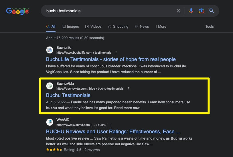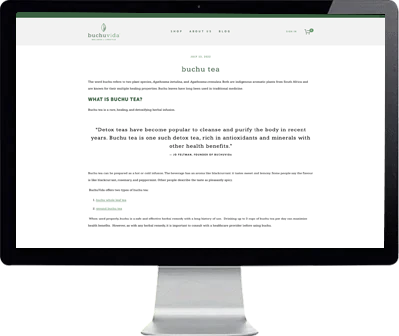 "Mackenzie's list-style article, "Buchu Testimonials", became our top-performing blog post. It ranks on the first page of Google and has a good click-through rate for its position. "