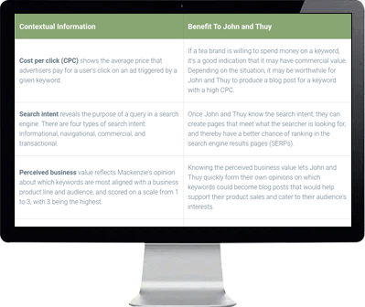 “Tracie can use the keyword research she purchased to prioritize what blog posts to produce for her business, Tea With Tracie."