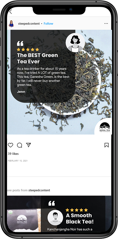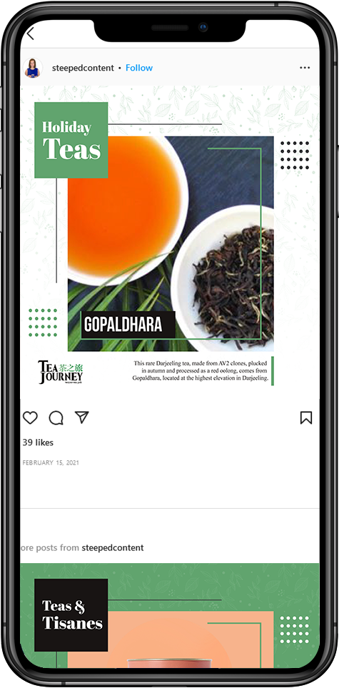 "I'm really impressed with Steeped Content! I've been using Mackenzie to create social media posts that help drive sales, and the results have been good. The images she creates are beautiful, and she writes high-quality captions. I recommend Steeped Content to anyone in the tea or coffee industry who needs help with social media posts."